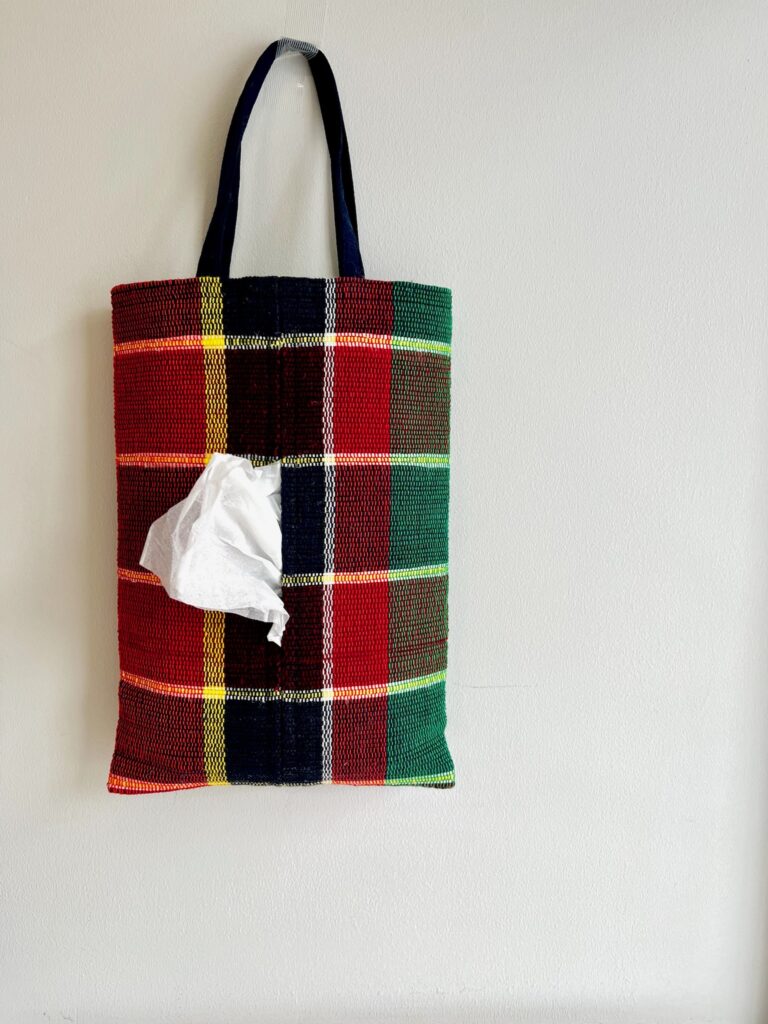 15周年にハングティッシュBOXカバーが加わりました。ティッシュBOXの為のちいさなバッグです。吊り下げタイプの為、おうちの壁はもちろんのこと、車の中やアウトドアでも活躍します。