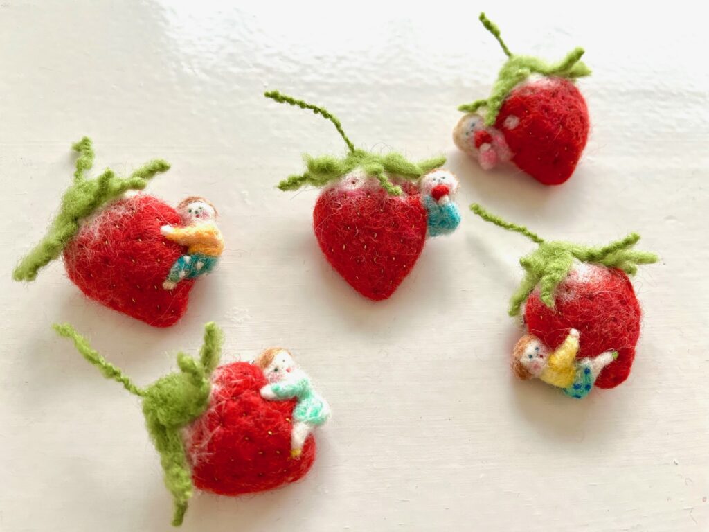 オーブン15周年と15(いちご)をかけて、いちごブローチを作っていただきました。苔ノ森商店でも人気シリーズのちいさいひとが一生懸命しがみつく姿や、つまみ食いしちゃっている姿が可愛らしいです。いちごの色味やヘタのリアルな仕上りもハンドメイドならではの一品です。