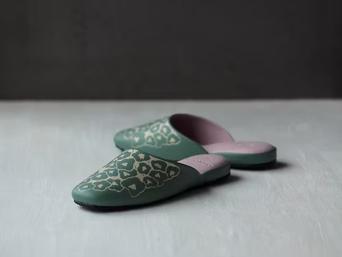 革靴を作るように手間をかけて仕上げられたつま先の丸みと、特殊な機械でくるみ底製法により丈夫に仕上げられた底が特徴的な、素敵なスリッパが並びます。贅沢仕上げでありながらも、素材はビニールレザーの為お手入れが簡単なのも嬉しい仕様です。