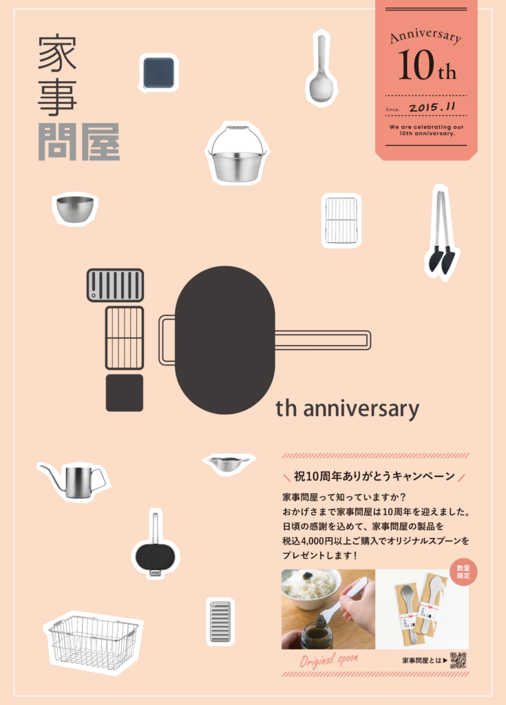 〈家事問屋〉10周年を記念し、フェアを開催いたします。〈家事問屋〉商品4,000円以上お買い上げの方に、10周年記念「オリジナルスプーン」をプレゼント。(プレゼントは無くなり次第終了となります)